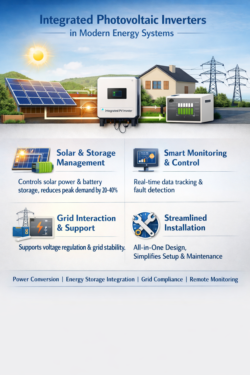العاكسات الكهروضوئية المتكاملة أصبحت مكونًا مركزيًا في العديد من منشآت الطاقة الشمسية، حيث تجمع بين تحويل الطاقة والتحكم في النظام ووظائف المراقبة داخل جهاز واحد. بدلاً من العمل كمحول من تيار مستمر إلى تيار متردد فقط، تعمل هذه المعدات الآن كنقطة تنسيق بين الوحدات الكهروضوئية ووحدات تخزين الطاقة وشبكة الطاقة.